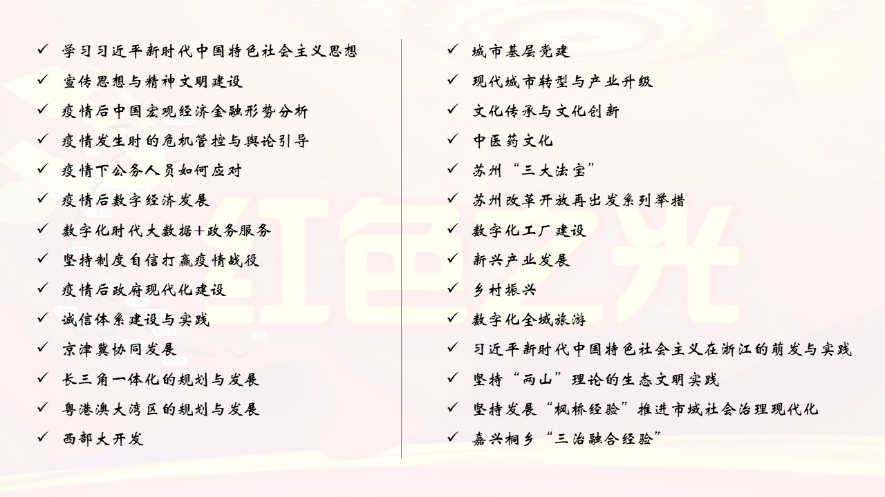 疫情后政府現代化建設,誠信體系建設與實踐,京津冀協同發展,長三角一體化的規劃與發展 粵港澳大灣區的規劃與發展 西部大開發城市基層黨建,現代城市轉型與產業升級,文化傳承與文化創新