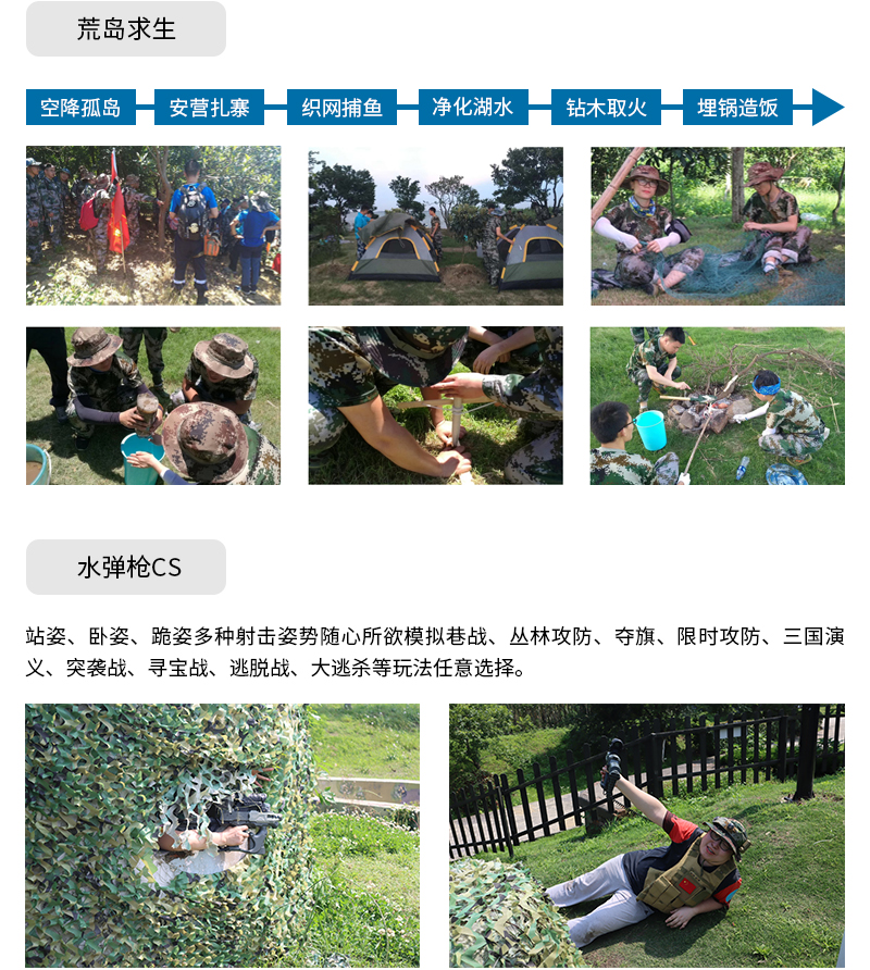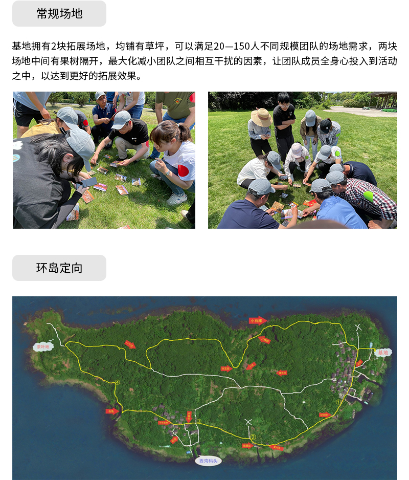 基地環境幽美,四面環水。草坪、帳篷、烤爐、土灶、拓展道具、民宿、快艇均有配套;不一樣的風景與配套設施,帶給團隊不一樣的體驗與收獲。全年均可露營、團建、拓展、定向、荒島、CS、燒烤等各類主題活動。遠離城市的喧囂,回歸自然的平靜。