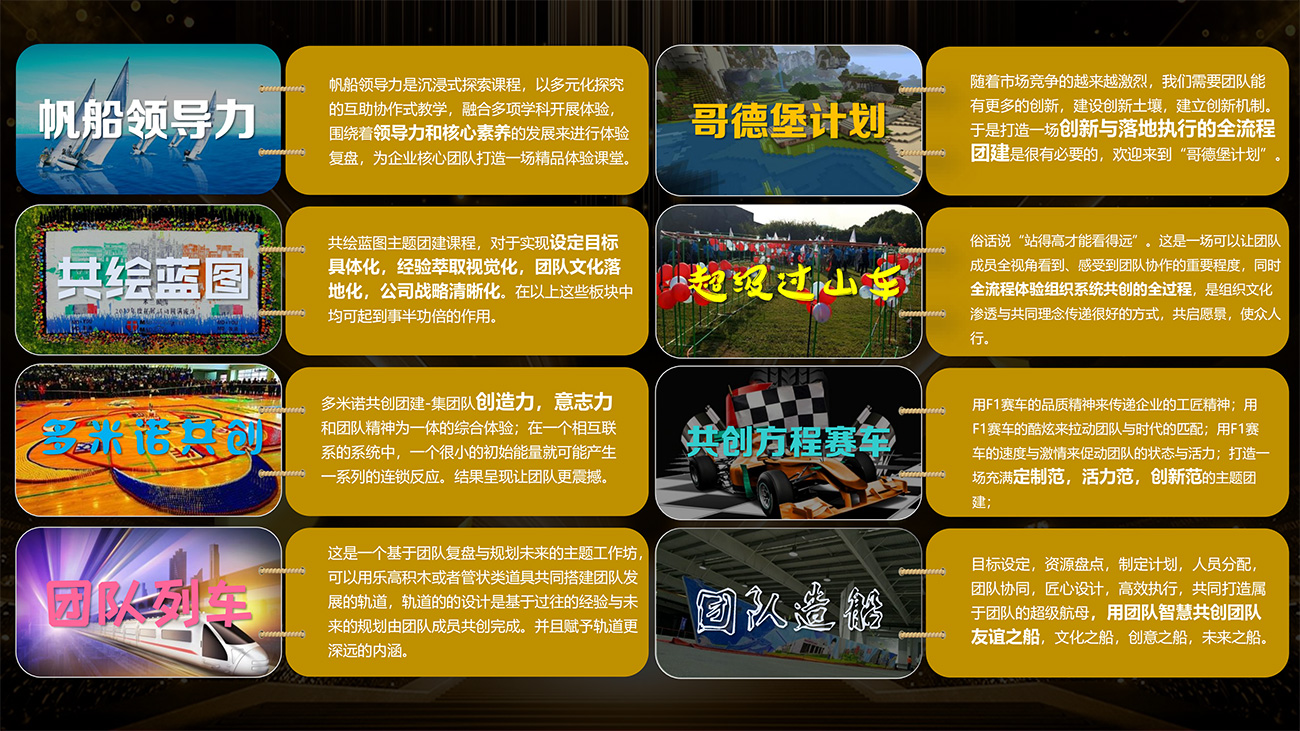榮耀時(shí)刻是面向企業(yè)主力軍或全員的文化賦能系列主題活動(dòng),通過(guò)所有人明確分工與整體協(xié)同一起完成一個(gè)大任務(wù)。在短時(shí)間內(nèi)共同經(jīng)歷團(tuán)隊(duì)創(chuàng)意的潮流設(shè)計(jì)和極致體驗(yàn),一起見(jiàn)證團(tuán)隊(duì)共創(chuàng)的結(jié)果。榮耀時(shí)刻將打造一個(gè)大團(tuán)隊(duì)共創(chuàng)的產(chǎn)品生態(tài)圈。 形成一個(gè)屬于創(chuàng)新型團(tuán)隊(duì)的智慧新世界。我們將持續(xù)為團(tuán)隊(duì)提供潮酷的全場(chǎng)景體驗(yàn),打造團(tuán)隊(duì)向往的潮流團(tuán)建方式。
