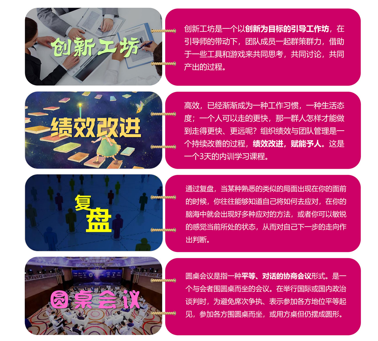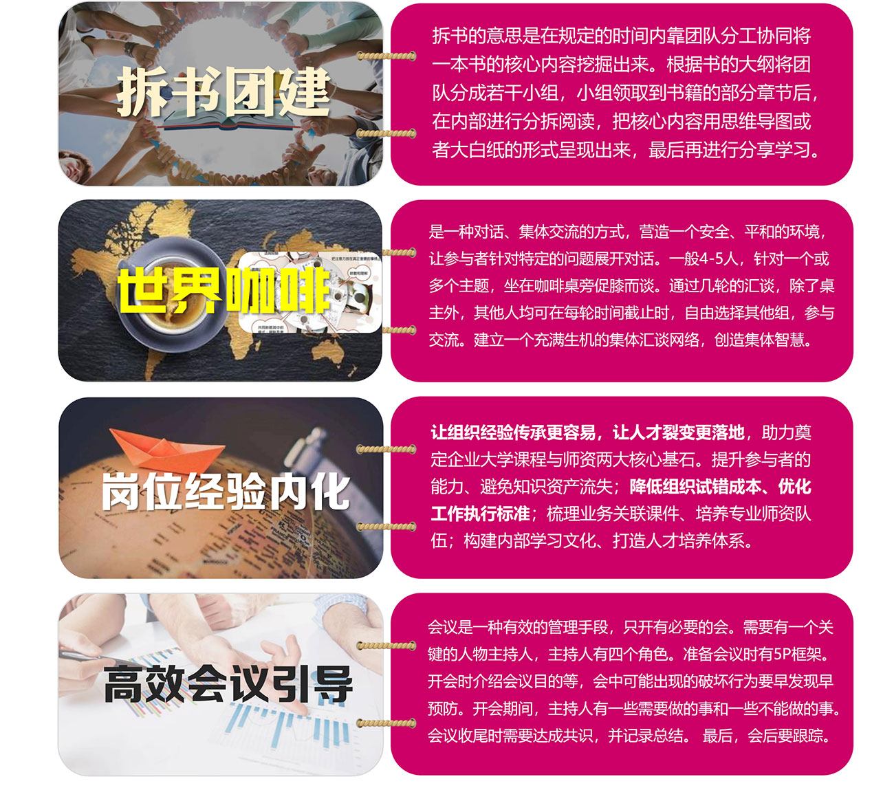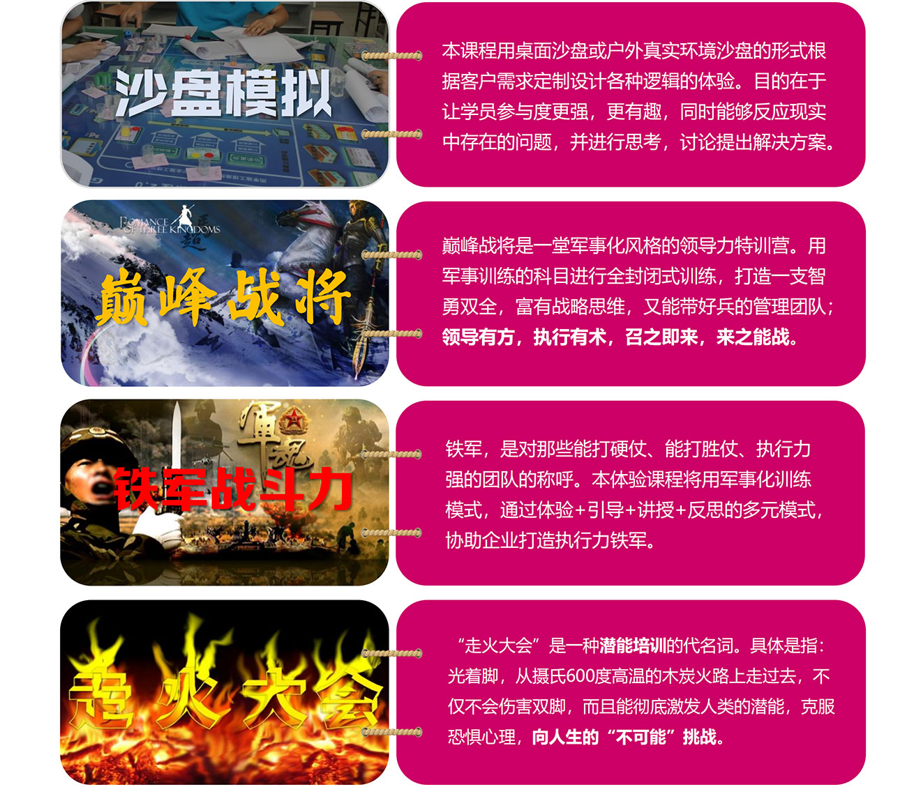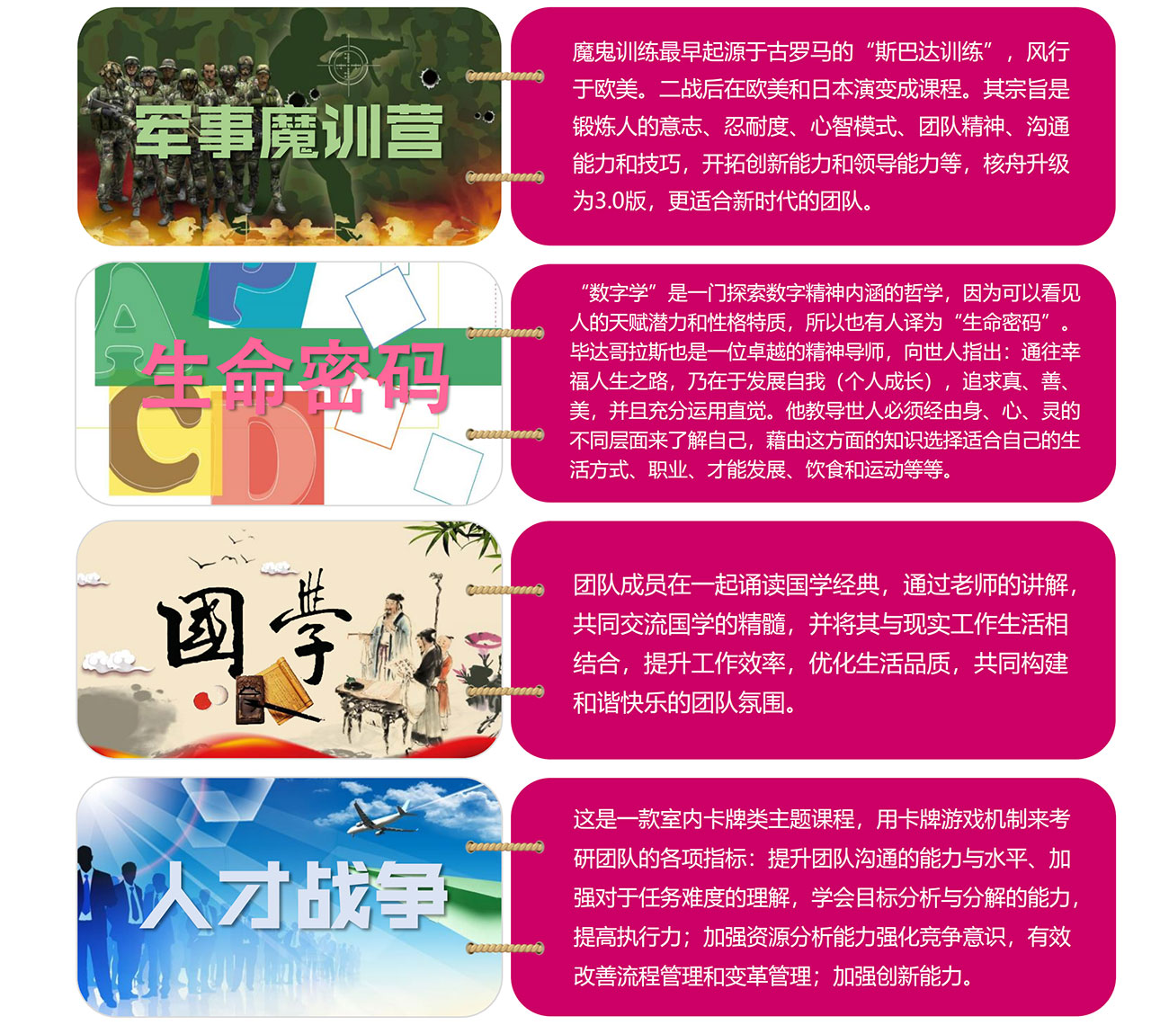 培訓(xùn)團(tuán)建,一種寓教于樂(lè)的學(xué)習(xí)方式,一種互動(dòng)交流游戲化的成長(zhǎng)方式;在共同學(xué)習(xí),共同聽(tīng)講,共同研討,共同提升中增進(jìn)友情,提升共同的認(rèn)知邊界。學(xué)習(xí)提升和團(tuán)隊(duì)建設(shè)雙收獲。