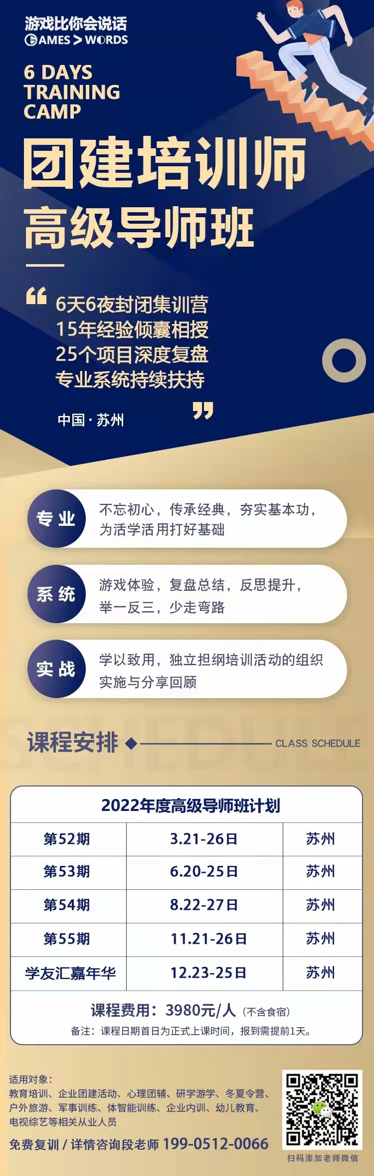 P.S.《游戲比你會說話》團建拓展培訓師培訓是一個專門培養團建拓展教練的平臺,體驗式培訓師培訓認證班和數字團建培訓師培訓班以及各種項目線下交流研討活動。助力你開啟職場游戲化培訓之旅。